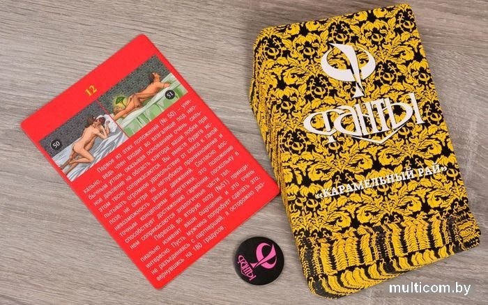 | Информация | Воплощение сладких желанийГоворят, что стоит попасть на удочку привычки — и прощай, супружеская любовь. А ведь это совсем не повод скандалить, менять партнёра или заводить интриги на стороне. «Стряхнуть пыль» с прежних отношений очень просто, играя в фанты «Карамельный рай». Веселая эротическая игра снова превратит супружескую спальню в райское местечко.Волшебный и загадочный ВостокНа Востоке всегда знали толк в любовных утехах. Но вам не придётся тратить время на поиски проверенных восточных рецептов страсти: многое уже предложено в этих фантах. Проникновенная, сладострастная близость, дополненная очарованием Востока и тайнами тантрического секса, позволит по-новому узнать любимого человека, добавив новых красок в интимные отношения.Фанты бывают разные: жёлтые или красныеНа самом деле фантов в игре четыре вида: белые, жёлтые, розовые и красные. Игроки втёмную выбирают фант, на обратной стороне которого написано задание. Игра начинается с простых заданий на белых фантах, цель которых развеселить и слегка возбудить партнёров. Дальше играют жёлтые фанты, а задания становятся более сексуальными. Продолжая игру, партнёры переходят к розовым и красным карточкам, всё более отдаваясь страстным порывам и удовлетворяя друг друга всевозможными способами.Формула сохранения любвиНовые удовольствия со старым партнёром — это лучшая возможность разнообразить личную жизнь без романов на стороне. Игра познакомит с новыми позами, заставит экспериментировать в постели и открывать в себе новые океаны нежности и любви. Задания в игре часто предлагают применение секс-игрушек, сексуального белья и интимной косметики. Долой стеснительность! Фанты «Карамельный рай» научат быть уверенным в себе и партнёре на сто процентов.Подарок, который оценят по достоинству:Молодожёны, только отрывающие для себя все тайны и прелести близких отношений;Постоянный партнёр, который совсем не прочь подлить масла в костёр любви;Сторонники активной жизни и любви, желающие добавить новизны в отношения и до конца раскрыть свой чувственный потенциал. |