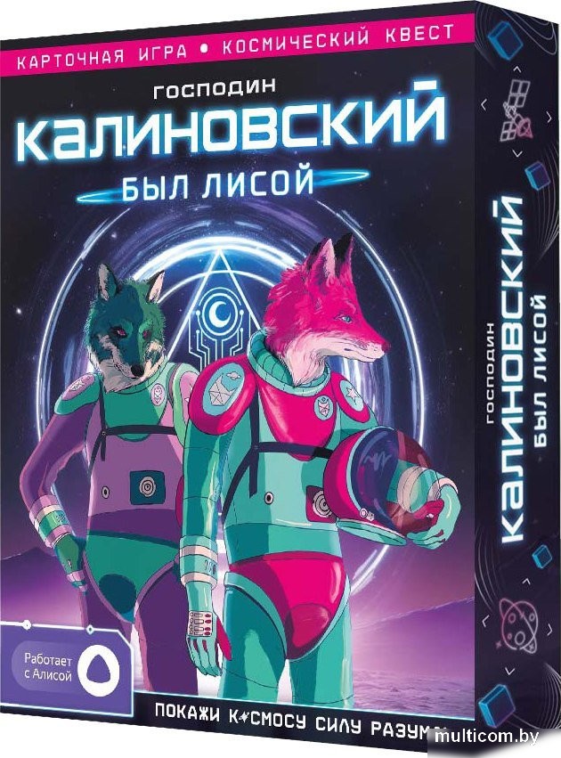 | Информация | «Господин Калиновский был лисой» — это карточная игра с захватывающим сюжетом, кооперативное приключение с голосовым помощником и путешествие в мир героев комикса. Игрокам предстоит исследовать неизвестные планеты: выполнять задания, решать головоломки и перемещаться в космическом пространстве вместе с героями комикса Софьи Мироедовой — лисом Калиновским и волком Норштейном._x000D_ |