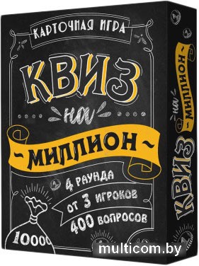 | Информация | Настольная игра "Квиз" от "Геодом" - это целых 400 крутых и неожиданных вопросов для детей и взрослых, стильная упаковка и неограниченное количество вариантов игры. Играйте вдвоем, играйте в кругу семьи или в дружной большой компании - процесс в любом случае окажется веселым и увлекательным! Игра не требует особенной подготовки либо фундаментальных знаний, здесь важна скорость реакции, сообразительность и смекалка, ведь ответ на вопрос очень часто лежит на поверхности. |