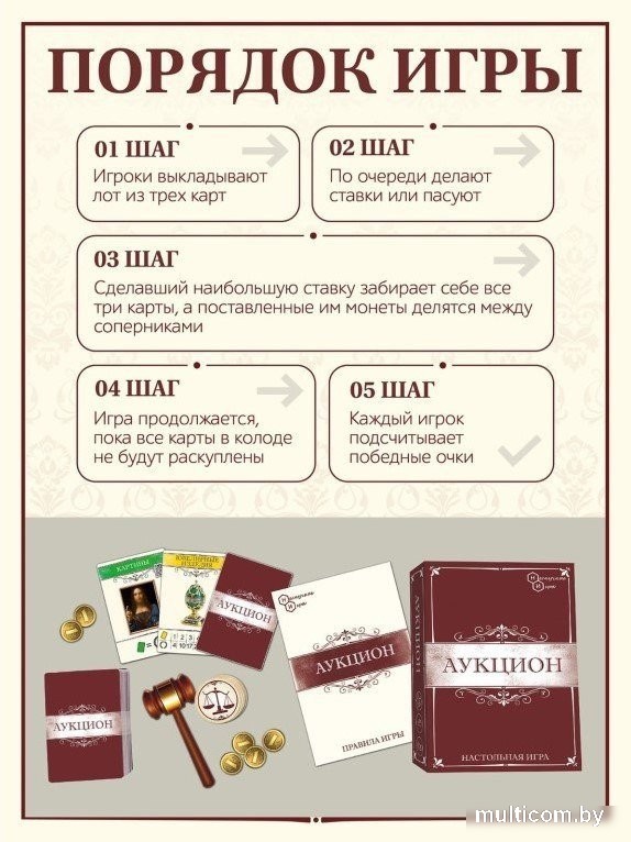 | Информация | - В этой захватывающей карточной игре вам предстоит погрузиться в мир аукционных торгов, где вы будете соревноваться за уникальные виды антиквариата. Каждый новый лот может принести вам бонусы и дополнительные очки, но не забывайте о рисках неудачных инвестиций. - Ваши соперники не дремлют и могут перебить ваши ставки, что добавляет элемент стратегии и напряжения. Цель игры — приобрести наиболее ценные лоты по выгодной цене, что требует умения и тактики. - В игре представлено 6 видов карт, каждая из которых приносит победные очки по своему уникальному принципу. Тот, кто в конце игры соберет наиболее выигрышную комбинацию, станет победителем. - Будьте готовы к неожиданным поворотам и интересным решениям! |