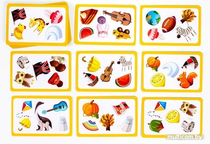 | Информация | Весёлая игра для самых внимательныхНа карточках то появляются новые предметы, то пропадают. Попробуйте уследить за всеми картинками, запомнить их и найти нужные. Ну а победит самый внимательный и быстрый игрок!Смотрите — запоминайте — угадывайте!Все участники внимательно смотрят на верхнюю карту колоды и запоминают картинки, которые на ней нарисованы. Затем один из игроков переворачивает карточку. На её обороте изображены эти же предметы и добавлен ещё один, которого не было на лицевой стороне.Задача участников — как можно быстрее назвать появившийся предмет. Как только кто-либо его называет, игра останавливается и догадка проверяется.Если участник правильно назвал предмет, то он забирает эту карточку себе.А если игрок не угадал, то отдаёт одну из своих заработанных карточек и кладёт её в отдельную колоду сброса.Победит тот, кто первым наберёт 6 карт! |