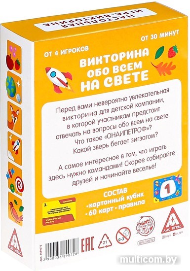 | Информация | Викторина обо всём на свете Перед вами невероятно увлекательная познавалка для детской компании, в которой участникам предстоит отвечать на вопросы обо всём на свете. Например, что такое «онаипетроф»? Какой зверь бегает зигзагом? Играть в неё нужно командами, скорее собирайте друзей и начинайте веселье! Что нужно делать? Итак, участникам предстоит отвечать на разного рода вопросы. Какие именно? В этом вам поможет кубик. Бросьте его! Выпала цифра 1? Придётся научиться читать задом наперёд! Выпала цифра 2? Отвечайте на обычные вопросы с вариантами ответа. Выпала цифра 3? Придётся объяснять слова иначе. А за правильность ответов участники будут получать очки. Чем их больше, тем ближе команда к победе! |