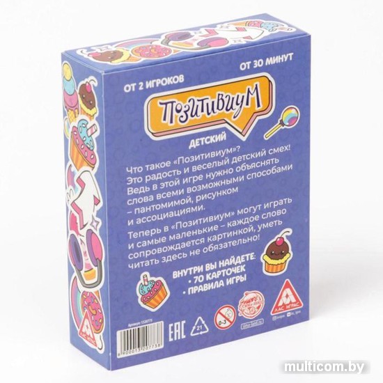 | Информация | Ура! Теперь играть в «Позитивиум» стало ещё проще и интереснее, ведь на карточках появились картинки! Даже самые маленькие с удовольствием примут участие в процессе, и им не нужно будет читать слова. Берите эту игру на любой семейный праздник! И как же в неё играть? Правила предельно просты: участники по очереди вытягивают карточки и объясняют слова, которые на них написаны. Задача каждого игрока — за 1 минуту объяснить все 3 слова с карточки. Какие задания есть на карточках? Пантомима. Нельзя использовать слова и звуки. Проявите свои артистические способности — объясняйте всё с помощью мимики и жестов! Рисунок. Во время объяснения можно только рисовать. Слова. Объяснять нужно устно, не используя однокоренные слова. Если игрок справился с заданием, он забирает карточку себе. А если нет, карточка уходит в сброс. А победит тот, у кого больше всего карточек! |