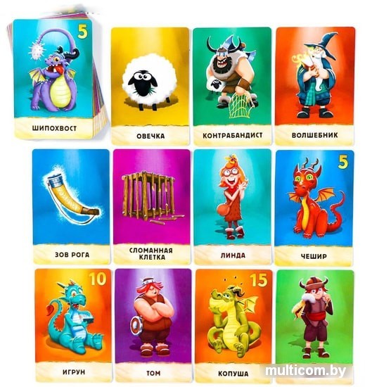 | Информация | По мотивам игры «Спящие королевы»Приручи дракона!Откройте коробку и познакомьтесь с забавными драконами! Здесь есть сонный Копуша, скоростной Вьюх Быстрый, вечно голодный Камнежор и другие. Вы тут же к ним привяжетесь и, конечно, захотите забрать к себе домой. Это и есть цель игры: приручите как можно больше драконов и вы победите!Контрабандисты, овечки, волшебники, драконы — сюжет игры потрясает!Представьте, что вы находитесь на земле драконов. Разложите карточки с драконами на столе. Сейчас все огнедышащие мирно спят. Ваша задача разбудить дракончиков по правилам и приручить каждого!Начните игру, и сами убедитесь, насколько она интересна!Для этого всем игрокам раздаются карты-действия. Например, с картой «Ребёнок» вы сможете забрать одного дракона себе! А если такой нет, стащите дракона у соперника, выложив карту «Контрабандист». Всех секретов карт-действий мы открывать не будем...Кстати, драконы тоже непростые: у многих есть особые свойства!Например, улыбчивый дракон Чешир может разбудить ещё одного дракона, и у вас будет уже две карты!За каждого огнедышащего вы получаете баллы. У кого их больше, тот и победил! |