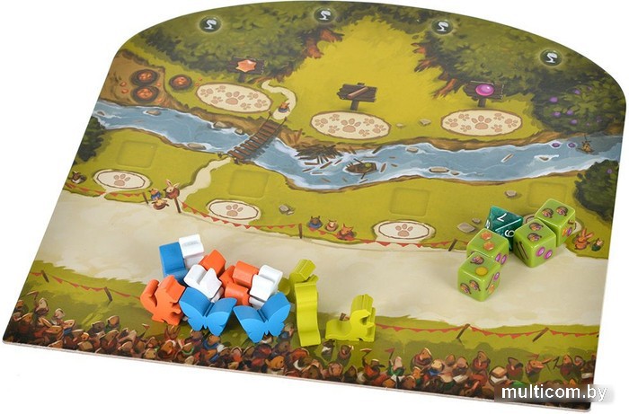 | Комплектация | 4 планшета игроков 4 уникальных кубика ресурсов Восьмигранный кубик 12 фишек друзей: - 3 бабочки - 3 лисички - 3 ящерки - 3 мышки 60 карт 16 жетонов парада 2 жетона Луны и Солнца 55 жетонов победных очков 48 фишек ресурсов (ягоды, ветки и смола) Игровое поле Правила игры |