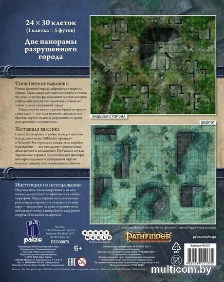 | Информация | Руины древнего города заброшены и поросли травой. Здесь давно уже никто не живёт, и только по ночам у костра рассказывают жуткие истории о бродящих среди руин чудовищах. Какие же тайны хранит затерянный город?Теперь вам не нужно тратить время на прорисовку карт – это поле позволит детально изобразить спуск в подвалы разрушенного храма или сражение с культистами.Самые популярные игровые поля для настольной ролевой игры Pathfinder приходят в Россию! Это городские улицы, леса, корабли и развалины – все они делают приключения атмосфернее и динамичнее. Прочные и детализированные игровые поля позволяют фиксировать происходящее и превращают партии в по-настоящему запоминающиеся события. |