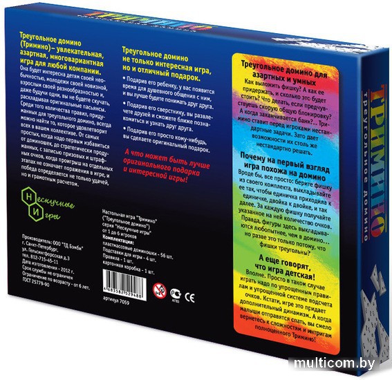 | Информация | Настольная игра для тех, кто умеет просчитывать ходы, создавать хитроумные комбинации и не боится блефовать. Здесь не нужно искать простых решений – чем сложнее фигура, которую сложит игрок, тем больше очков он заработает. Цель игры – выкладывать треугольные фишки так, чтобы цифры, нанесенные на грани, совпадали с отметками фишек, которые уже лежат на столе. На каждой фишке есть три цифры от 0 до 5, комбинации не повторяются. |