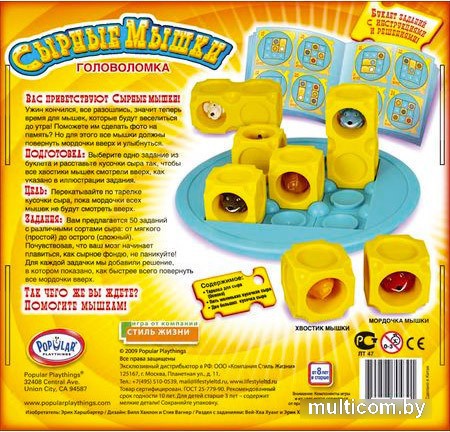 | Информация | Выберите одно задание из буклета и расставьте кусочки сыра так, чтобы все хвостики мышек смотрели вверх, как указано в иллюстрации задания. Вам нужно перекатывать по тарелке кусочки сыра, пока мордочки всех мышек не будут смотреть вверх. |