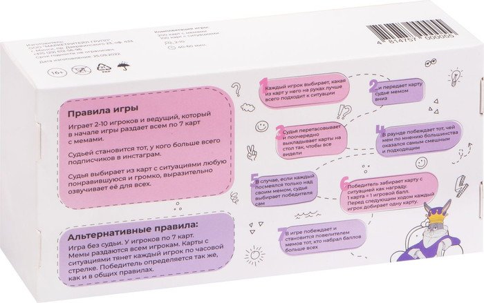 | Комплектация | - 200 карточек мемов. - 100 карточек ситуаций. |