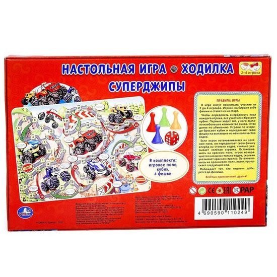 | Информация | Настольная игра-ходилка "Суперджипы" от компании "Умка" представляет собой яркое поле с цветным изображением гоночной трассы, которую и предстоит пройти участникам "заезда". Бросая специальный кубик, они будут передвигать свою фишку вперед, однако на их пути к финишу будут различные препятствия, которые лучше обходить стороной. |