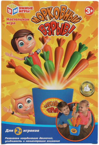 | Информация | Эта красочная игра приведет малышей в восторг. Играть в неё очень легко: поставить ведёрко, опустить его дно и разместить в ведёрке разноцветные морковки. После чего игроки должны по очереди вытаскивать морковки. Проигрывает тот игрок, который вытянул неправильную морковку и ведёрко рассыпалось. |