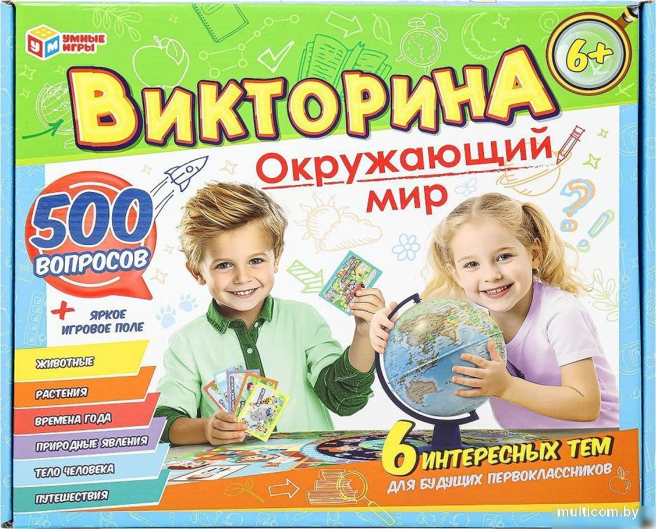 | Комплектация | 500 вопросов; 500 ответов; яркое игровое поле; кубик и 4 фишки; правила игры |