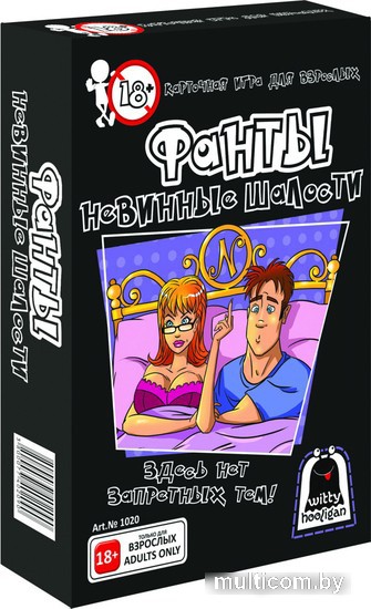 | Информация | «Невинные шалости» — это очень интимная и интригующая игра, которая предназначена исключительно для двоих. В комплекте собраны самые откровенные фанты, которые зажгут огонь в ваших отношениях. |