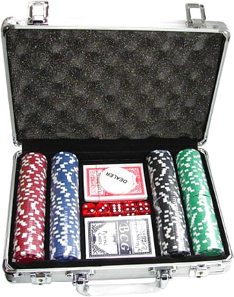 | Комплектация | 1 алюминиевый кейс 30х20х6,5 см200 фишек весом 11,5 г без номинала (50 синих, 50 зеленых, 50 черных, 50 красных (допускаются комбинации из 5 основных цветов: белый, черный, синий, красный, зеленый))2 колоды карт для покера5 красных кубиков (1,7х1,7см)1 фишка Дилера |