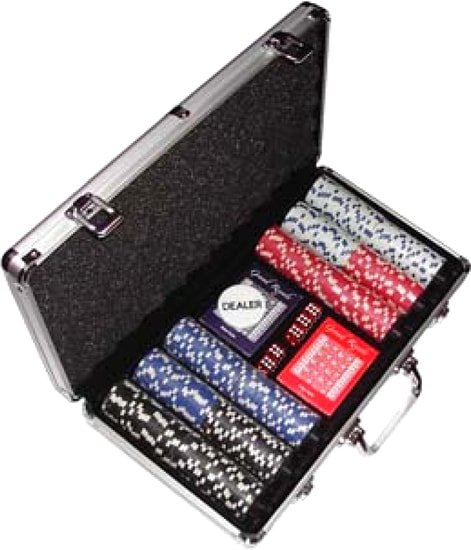 | Комплектация | 1 алюминиевый кейс 39х21х6,5 см300 фишек весом 11,5 г без номинала (50 черных, 50 зеленых, 50 белых, 50 красных, 50 синих+50 дублируется один из цветов (черный, зеленый, белый, красный или синий))2 колоды карт для покера5 красных кубиков (1,7х1,7см)1 фишка Дилера |