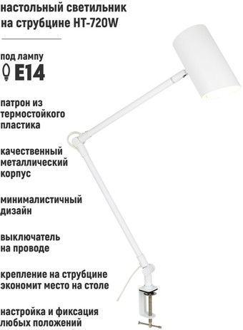 | Информация | ? Минималистичный дизайн. ? Качественное исполнение: корпус из металла. ? Струбцина экономит место на столе. ? Удобство: можно настроить и зафиксировать во множестве положений. |