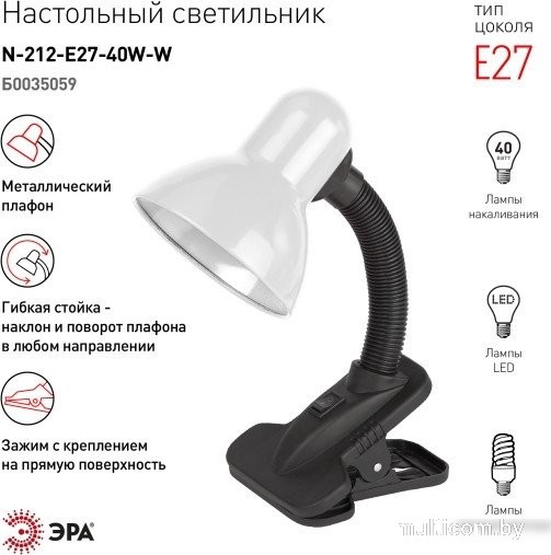 Информация | - Настольный светильник-прищепка ЭРА N-212-E27-40W-W может использоваться с лампой накаливания, компактной люминесцентной лампой (КЛЛ) или светодиодной (LED) лампой. - У светильника прочная удобная прищепка и металлический плафон. - Наклон и поворот плафона в любом направлении для удобного направления света. - Обратите внимание на качество и надежность данного светильника! |