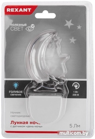 Информация | Светодиодный ночник REXANT ЛУННАЯ НОЧЬ предназначен для освещения бытовых помещений, коридоров, спален и санузлов в темное время суток.###BR###Благодаря приятному голубому свечению создает уют и комфорт в помещении. Выполнен из качественного белого пластика.###BR###Светодиодное освещение служит гораздо дольше обычных ламп и значительно сокращает энергопотребление. |