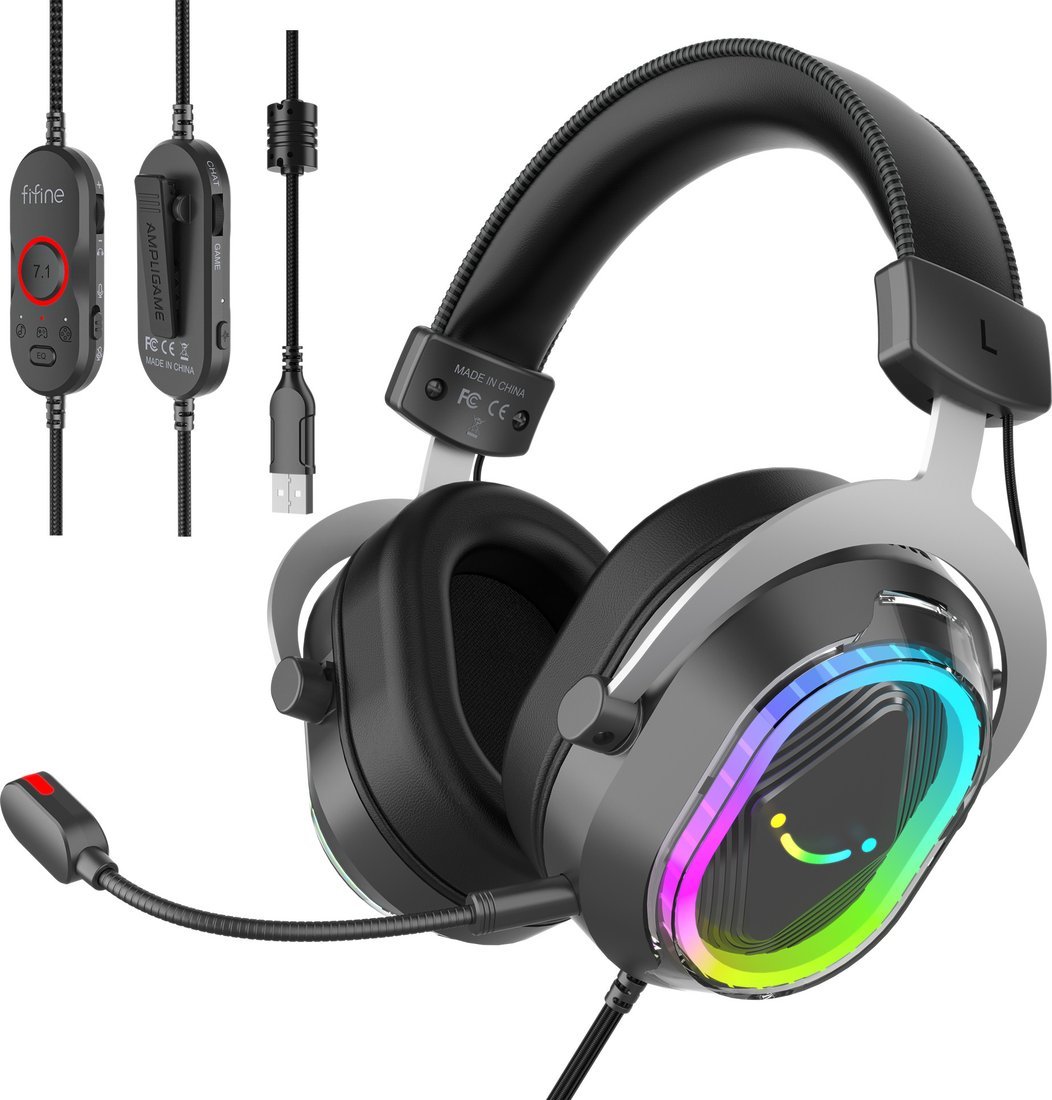 | Информация | - Fifine H13 - это полноразмерные геймерские наушники с яркой RGB-подсветкой и классическим черным дизайном, выполненные из сочетания пластика и металла для прочности и долговечности. Амбушюры из кожзама и мягкой пены обеспечивают комфорт даже при длительных игровых сессиях, а регулируемое оголовье позволяет подстроить наушники под любой размер головы. - Модель подключается по USB и оснащена длинным кабелем в тканевой оплетке, что исключает спутывание и изломы. Встроенный пульт управления на кабеле позволяет быстро активировать объемное звучание 7.1, регулировать громкость, переключать режимы эквалайзера, приглушать микрофон и отдельно настраивать баланс чата и игры. - Съемный конденсаторный микрофон на гибком держателе оснащен функцией шумоподавления, благодаря чему голос остается чистым даже в шумной обстановке. Чувствительность микрофона составляет -38 дБ, что позволяет эффективно улавливать речь, а также имеется отдельная кнопка включения шумоподавления на пульте. |