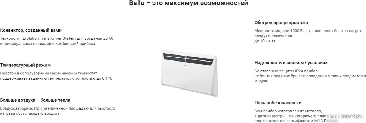 | Информация | - Конвекторы серии Evolution Transformer BEC/EVU-1000 НС-1081874 оснащены инновационным нагревательным элементом Hedgehog, что позволяет вам самостоятельно формировать набор необходимых опций и аксессуаров для эффективного обогрева. - Вы можете выбрать отопительный модуль нужной мощности на базе конвектора Evolution Transformer System. Также доступны три типа блоков управления: механический, электронный и с технологией Digital Inverter, что дает возможность настроить систему под ваши предпочтения. - Конвектор можно установить как настенно, так и напольно, в зависимости от ваших потребностей. В комплект входит только отопительный модуль с нагревательным элементом Hedgehog, а для полноценной работы необходимо добавить один из блоков управления и, при желании, шасси. - Evolution Transformer BEC/EVU-1000 идеально подходит для помещений площадью до 15 м?. Выбор между тремя системами управления обогрева позволяет легко адаптировать устройство под ваши нужды. Настенный монтаж осуществляется с помощью кронштейна, который входит в комплект, а для напольного варианта можно использовать дополнительный комплект шасси. - Воздухопропускные жалюзи Fine Screen увеличивают конвекционный поток, направляя его в помещение, а аэродинамическая система Intelligent Air Dynamic усиливает направленный поток на 37%, обеспечивая быстрый и эффективный нагрев. - Обратите внимание, что отопительный модуль работает только в сочетании с одним из блоков управления, которые необходимо приобретать отдельно. |