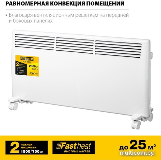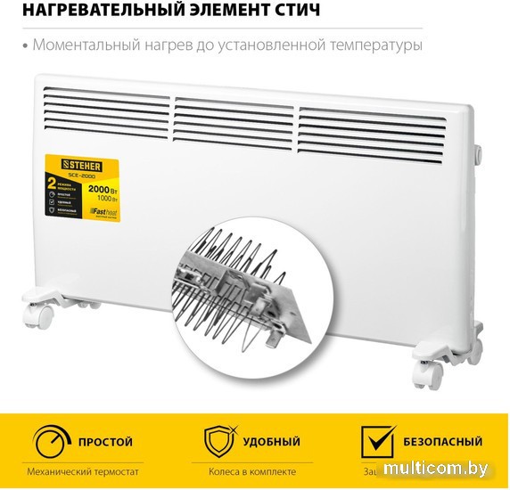 | Информация | ? Равномерная конвекция воздуха. ? Нагревательный элемент СТИЧ обеспечивает моментальный нагрев и остывание. ? Механический терморегулятор. ? Режим полной и половинной мощности. ? Кронштейн для крепления на стене в комплекте. ? Защита от опрокидывания. ? Бесшумная работа. |