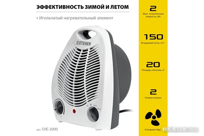 | Информация | ? Тепловентилятор STEHER 2 квт SVE-2000 оснащен высокоэффективным игольчатым нагревательным элементом мощностью 2000 Вт. ? Тепловентилятор отличается пониженным уровнем шума в процессе работы, что делает его использование максимально комфортным. ? Режим вентиляции без обогрева позволяет использовать прибор и летом в качестве обычного вентилятора. ? Возможность регулирования, как мощности, так и температуры нагрева воздуха позволяет создать наиболее комфортный микроклимат в помещении. |
