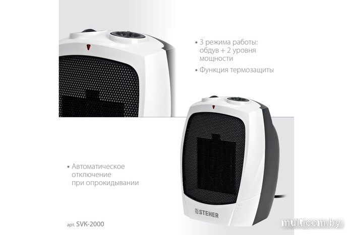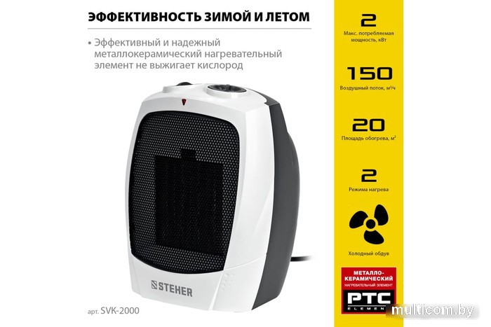 | Информация | ? Тепловентилятор STEHER 2 квт, металло-керамический нагревательный элемент SVK-2000 оснащен высокоэффективным металлокерамическим нагревательным элементом 2000 Вт. ? Тепловентилятор отличается пониженным уровнем шума в процессе работы, что делает его использование максимально комфортным. ? Режим вентиляции без обогрева позволяет использовать прибор и летом в качестве обычного вентилятора. ? Возможность регулирования, как мощности, так и температуры нагрева воздуха позволяет создать наиболее комфортный микроклимат в помещении. |