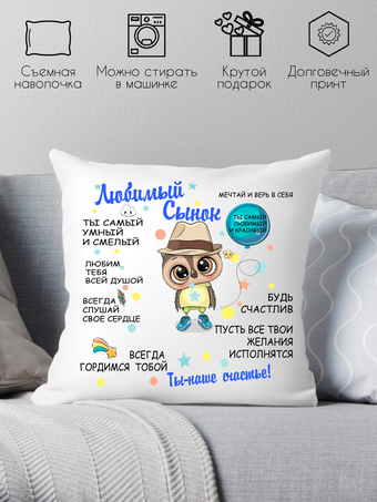 | Информация | Подушка сувенирная с печатью. Хороший и недорогой подарок на любой праздник. Будь то день святого валентина, день рождения, 8 марта или 23 февраля. Размер 40х40 см, наполнитель холлофайбер. Наволочка съемная на молнии — можно стирать в стиральной машине при температуре не превышающей 40 градусов. Печать термотрансферная. Печать не стирается. |