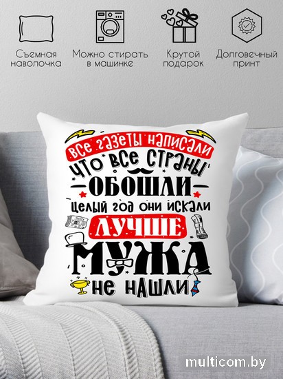 | Информация | Подушка сувенирная с печатью. Хороший и недорогой подарок на любой праздник. Будь то день святого валентина, день рождения, 8 марта или 23 февраля. Размер 40х40 см, наполнитель холлофайбер. Наволочка съемная на молнии — можно стирать в стиральной машине при температуре не превышающей 40 градусов. Печать термотрансферная. Печать не стирается. |