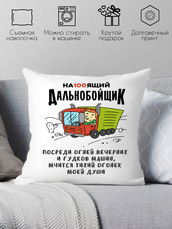 | Информация | Подушка сувенирная с печатью. Хороший и недорогой подарок на любой праздник. Будь то день святого валентина, день рождения, 8 марта или 23 февраля. Размер 40х40 см, наполнитель холлофайбер. Наволочка съемная на молнии — можно стирать в стиральной машине при температуре не превышающей 40 градусов. Печать термотрансферная. Печать не стирается. |