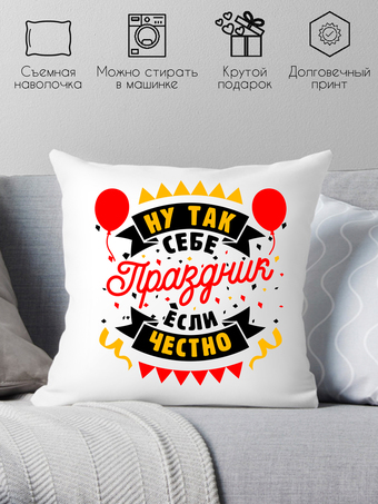 | Информация | Подушка сувенирная с печатью. Хороший и недорогой подарок на любой праздник. Будь то день святого валентина, день рождения, 8 марта или 23 февраля. Размер 40х40 см, наполнитель холлофайбер. Наволочка съемная на молнии — можно стирать в стиральной машине при температуре не превышающей 40 градусов. Печать термотрансферная. Печать не стирается. |