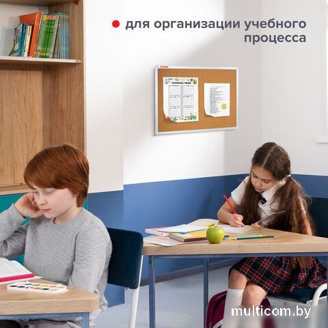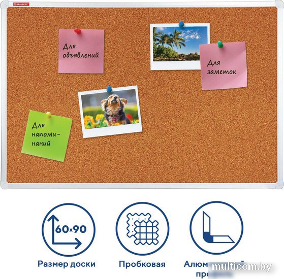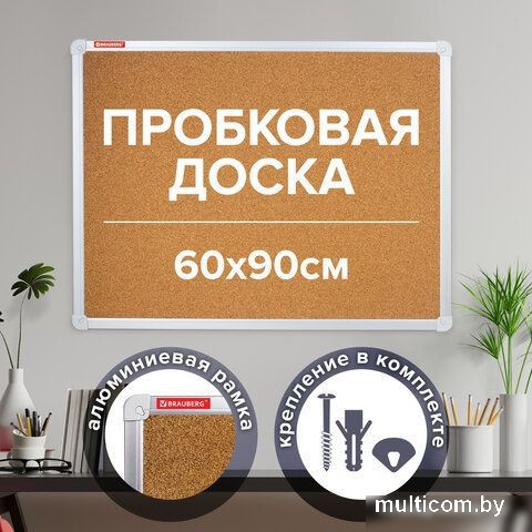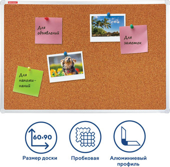 | Информация | Пробковая доска BRAUBERG позволит разместить объявления при помощи кнопок и офисных булавок. Широко используется в организациях различного рода деятельности. Поверхность изготовлена из натуральной пробки. Имеет улучшенную алюминиевую рамку и укрепленные пластиковые уголки. Размер доски — 60х90х1,5 см. Цвет покрытия: коричневый. Возможность горизонтального и вертикального размещения доски. Крепится к стене, элементы крепления входят в комплект. Тип покрытия доски: пробковое покрытие Размер (ВхШхГ): 60х90х1,5 см Цвет покрытия: коричневый Материал рамы: алюминий Серия: Cork Укреплённые пластиковые уголки: да Крепление информации с помощью: булавок, кнопок |
