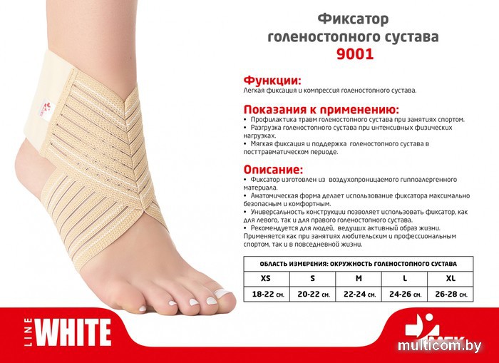 | Информация | Легкая фиксация и компрессия голеностопного сустава. Описание:Фиксатор изготовлен из воздухопроницаемого гипоаллергенного материала. Анатомическая форма делает использование фиксатора максимально безопасным и комфортным. Универсальность конструкции позволяет использовать фиксатор, как для левого, так и для правого голеностопного сустава. Рекомендуется для людей, ведущих активный образ жизни. Применяется как при занятиях любительским и профессиональным спортом, так и в повседневной жизни. Показания к применению:Профилактика травм голеностопного сустава при занятиях спортом. Разгрузка голеностопного сустава при интенсивных физических нагрузках. Мягкая фиксация и поддержка голеностопного сустава в посттравматическом периоде. Противопоказания:Аллергические реакции, гиперчувствительность, непереносимость сырья. Наличие в области применения фиксатора трофических язв, контактных дерматитов и других воспалительных поражений кожи. |