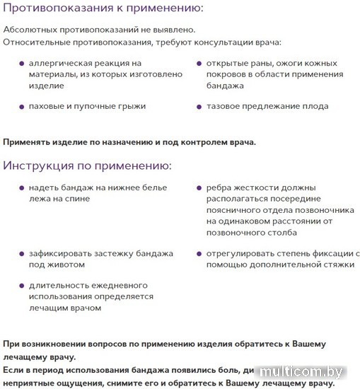 | Информация | Изготовлен из воздухо- и влагопроницаемого материала с высоким содержанием хлопка, не вызывает аллергии и раздражения кожи. Снабжен прочной, износостойкой застежкой «Велкро» под животом с увеличенной площадью контакта и дополнительной стяжкой для оптимального размещения бандажа. Удобная система крепления позволяет индивидуально регулировать степень фиксации. Два пластиковых ребра жесткости снижают избыточную нагрузку на поясничный отдел позвоночника и препятствуют скручиванию бандажа, анатомическая конструкция бандажа с вырезом по линии бедер позволяет надежно поддерживать живот, не ограничивая движения и ходьбу. Бандаж не заметен под одеждой, комфортен при носке в любое время года. Функции:эластичная поддержка живота. стабилизация положения внутренних органов и матки. обеспечение нормального положения плода. предохранение кожи живота от чрезмерного растяжения. снижение нагрузки на пояснично-крестцовый отдел позвоночника. обеспечение комфортных движений и ходьбы. Показания к применению:нормально протекающая беременность с 20-24 недели. многоплодие, многоводие и гипертонус матки во время беременности. |