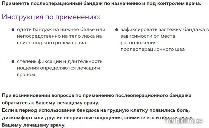 | Информация | Изготовлен из эластичного влаговпитывающего полотна с высоким содержанием хлопка, исключающего появление аллергических реакций. Бандаж имеет анатомическую форму, позволяющую оптимально разместить бандаж на грудной клетке мужчины, снабжен наплечными лямками для надежной фиксации бандажа на грудной клетке. Специальная вязка полотна обеспечивает отведение влаги с поверхности тела. Функции:обеспечение эластичной фиксации грудной клетки; уменьшение болей в области травмы, послеоперационной раны или рубца, в том числе болей при дыхании; оптимальные условия для заживления послеоперационной раны и формирования послеоперационных рубцов. Показания к применению:тупые и острые травмы грудной клетки; после операций на грудной клетке; межреберные невралгии и миозиты различной степени и локализации; профилактика перенапряжения мышц при физической нагрузке в послеоперационном периоде. Противопоказания к применению: абсолютных противопоказаний не выявлено. Относительные противопоказания, требуют консультации врача:синдром портальной гипертензии; наличие в области применения бандажа контактных дерматитов, трофических язв и пролежней; аллергическая реакция на материалы, из которых изготовлено изделие. |