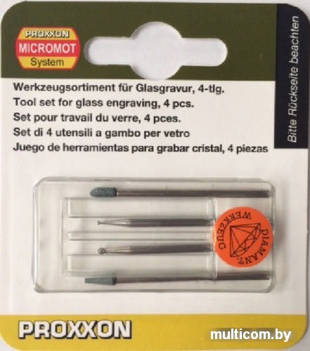 | Информация | Набор насадок для гравера гравировальных PROXXON 4 штуки (28920) используется для гравирования, шлифования и матирования стекла. Включается в себя два алмазных бора, диаметром 1 и 1,8 мм, а также два карбид-кремниевых бора конус (3/2х5) и пуля (2/2,5х7). |