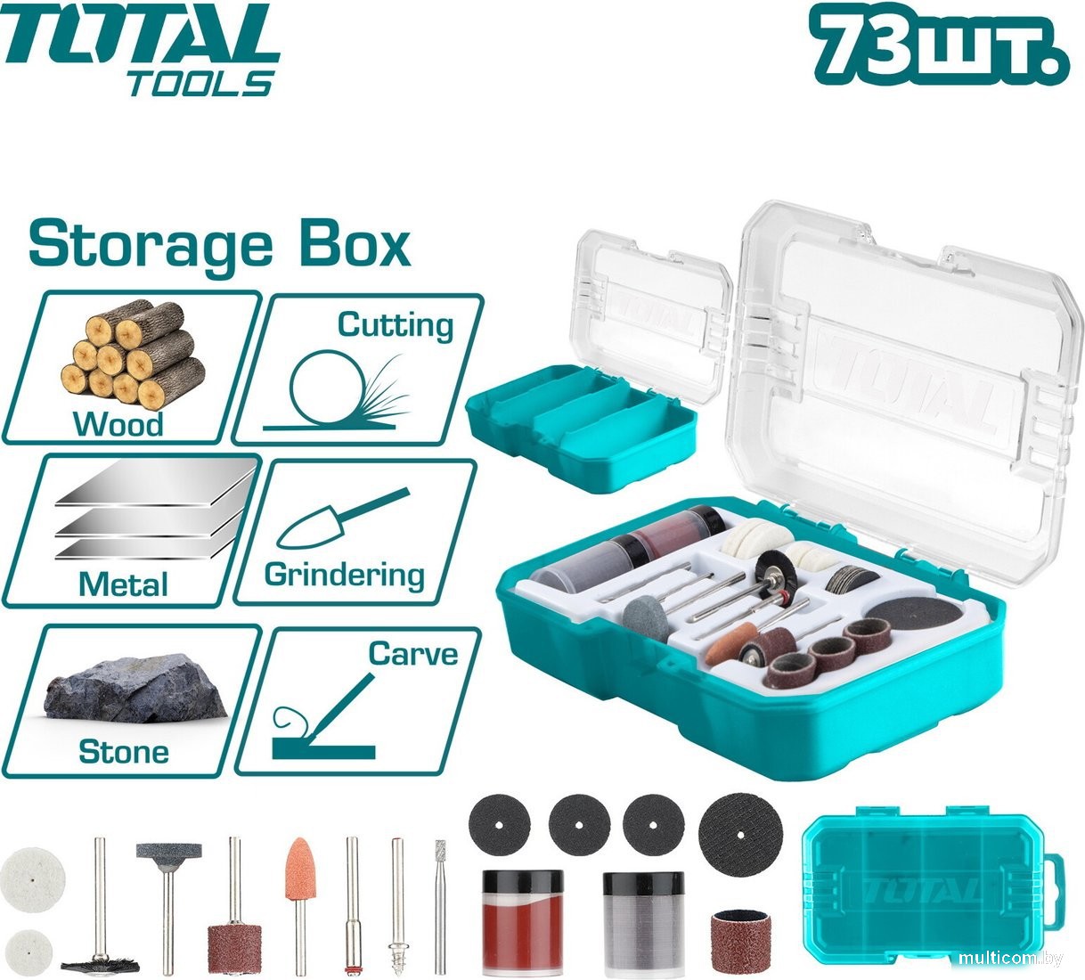 | Комплектация | Шлифовальные ленты (Sanding Band) - 4 шт. Шлифовальные камни (Grinding stone) - 2 шт. Отрезные круги (Cut-Off Wheel) - 36 шт. Шлифовальные диски (Sanding Disc) - 20 шт. Усиленный отрезной круг (Reinforced Cut-Off Wheel) - 1 шт. Полировальные круги (Polishing Wheel) - 4 шт. Полировальная паста (Polishing compound) - 1 шт. Фреза (High Speed Cutter) - 1 шт. Нейлоновая щетка (Nylon brush) - 1 шт. Опорные стержни (держатели) (Mandrel) - 2 шт. Шлифовальный барабан с опорным стержнем (Sanding drum with mandrel) - 1 шт. Пластиковый кейс (коробка с органайзером). |