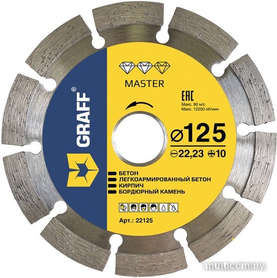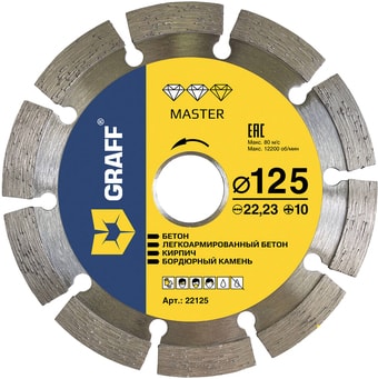 | Информация | Профессиональный алмазный отрезной диск 125x10x2,2x22,23 мм по бетону и камню GRAFF серия "Master". Сегменты высотой 10 мм прикреплены к телу диска посредством горячего прессования, что обеспечивает надежное и долговечное соединение для еще большего срока службы диска. Для более долгого срока службы данный диск рекомендуется применять с применением охлаждающей жидкости, но и сухая резка тоже допустима с максимальной скоростью вращения 12200 об/мин. Толщина реза 2,2 мм. Данный диск имеет посадку 22,23 мм и предназначен для использования на УШМ. |
