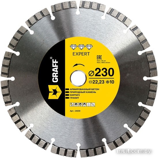 | Информация | Профессиональный алмазный отрезной диск 230x10x2,6х22,23 мм по армированному бетону и камню GRAFF серия "Expert". Сегменты высотой 10 мм прикреплены к телу диска посредством лазерной пайки, что обеспечивает надежное и долговечное соединение для еще большего срока службы диска. Для более долгого срока службы данный диск рекомендуется применять с применением охлаждающей жидкости, но и сухая резка тоже допустима с максимальной скоростью вращения 6600 об/мин. Толщина реза 2,6 мм. Данный диск имеет посадку 22,23 мм и предназначен для использования на УШМ. |