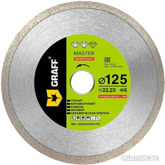 | Информация | Алмазный диск по керамической плитке диаметром 125 мм GRAFF для болгарки (УШМ). Диск изготовлен методом термической опрессовки и предназначен для резки настенной и напольной керамической плитки, искусственного камня, тротуарной плитки.Размер сплошного отрезного алмазного диска по плитке - 125x1,1х6x22,3 мм.Где: 125 мм - диаметр диска, 1,1 - толщина режущей кромки, 6 мм - высота режущего алмазного сегмента, 22,3 мм - посадочный диаметр.Диск может самозатачиваться за счет стирания слоя алмазной крошки во время работы. Для заточки необходимо сделать 2-3 реза по кремнию или абразивному камню. |