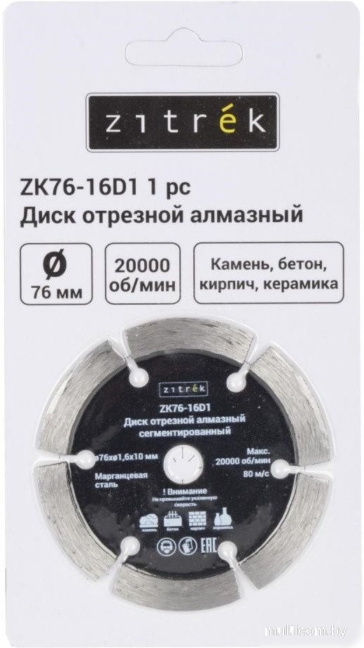 | Информация | Диск отрезной алмазный сегментированный Zitrek ZK76-16D1, 76x1,6x10мм, 1,6мм предназначен для использования с УШМ при отрезных работах по бетону, кирпичу и керамике. |
