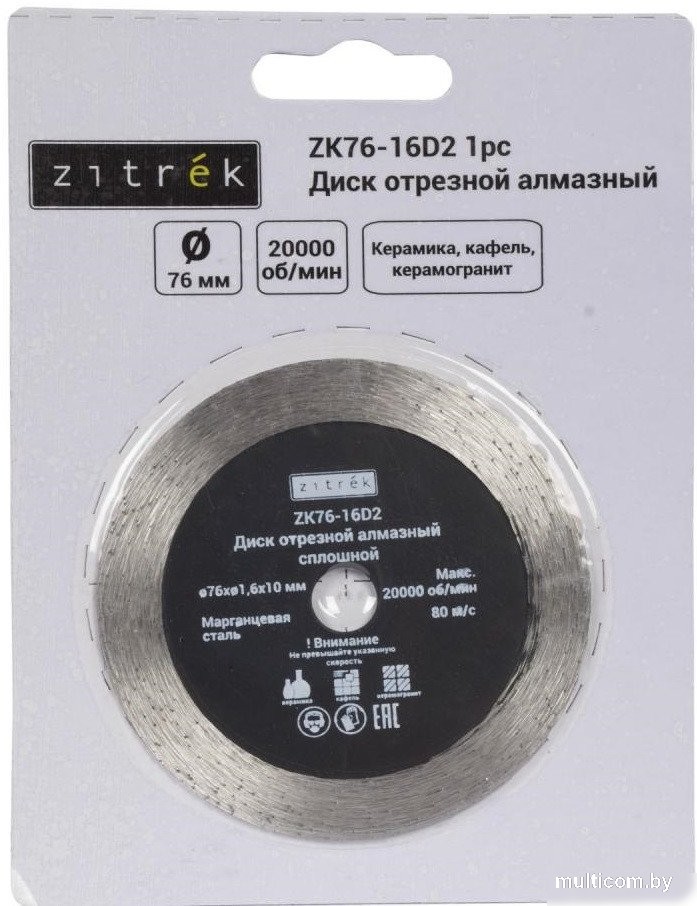 | Информация | Диск отрезной алмазный сплошной Zitrek ZK76-16D2, 76x1,6x10мм, 1,6мм предназначен для использования с УШМ при отрезных работах по керамике, кафелю и керамограниту. |