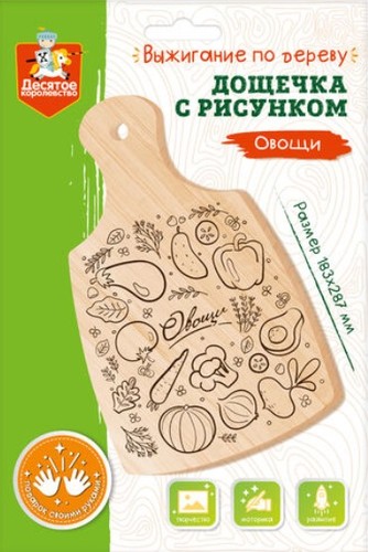 | Информация | Украсьте свой дом уютной композицией, созданной старинной техникой выжигания по дереву! Выжигание — это один из занимательных видов декоративного искусства. Овладение мастерством выжигания в дальнейшем позволит ребенку украшать своими руками шкатулки, разделочные доски, другие предметы интерьера. Это полезное и интересное занятие может стать серьезным увлечением ребёнка, которое даст толчок развитию мелкой моторики и художественного вкуса. Выжигать по дереву просто! |