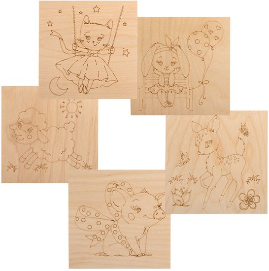 Комплектация | 5 досок для выжигания — сюжеты со зверятами (поросенок, олененок, котенок, зайка, барашек) |