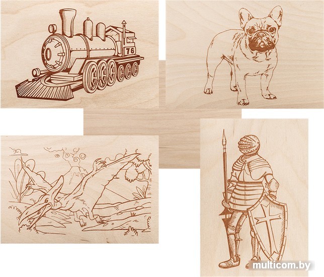 Комплектация5 досок для выжигания (4 доски с нанесенными картинками в различной тематике (воин, динозавр, собака, машина) и 1 доска для самостоятельного творчества (без эскиза рисунка)