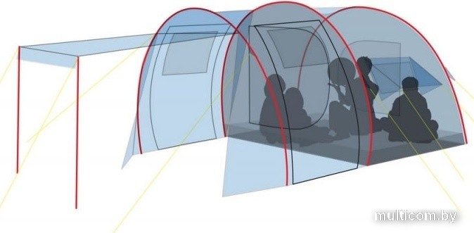 | Информация | Внешний тент палатки устойчив к ультрофиолетовому излучению и имеет пропитку, задерживающую распространение огняВнутри встроено кольцо для подвесного фонаря |