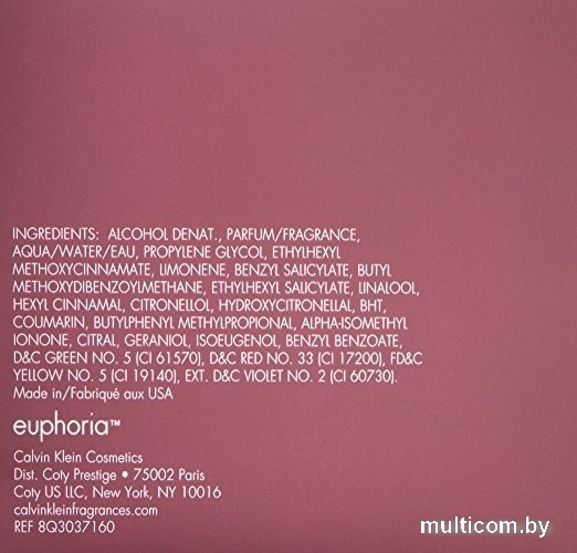 | Информация | Экзотический, цветочно-фруктовый аромат "Euphoria" от Calvin Klein - это воплощение гармонии, решимости и головокружительной чувственности. Очаровательный и яркий, он притягивает, искушает и зовет сполна насладиться жизнью. Пирамида аромата: верхние ноты - гранат, чампак, хурма, зелень; ноты сердца - лотос, магнолия, черная орхидея; ноты шлейфа - амбра, черная фиалка, красное дерево. |