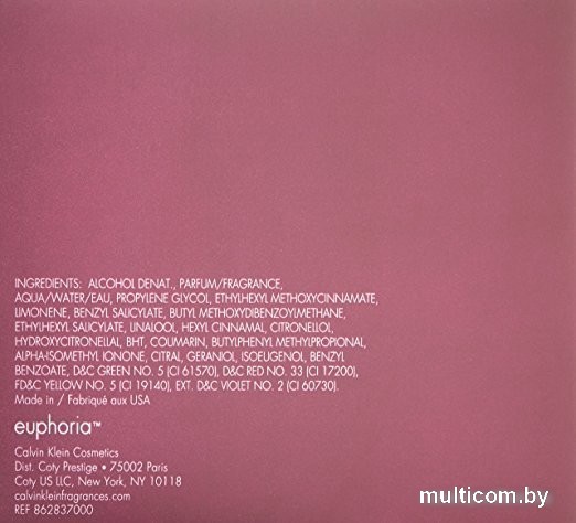 | Информация | Экзотический, цветочно-фруктовый аромат "Euphoria" от Calvin Klein - это воплощение гармонии, решимости и головокружительной чувственности. Очаровательный и яркий, он притягивает, искушает и зовет сполна насладиться жизнью. Пирамида аромата: верхние ноты - гранат, чампак, хурма, зелень; ноты сердца - лотос, магнолия, черная орхидея; ноты шлейфа - амбра, черная фиалка, красное дерево. |