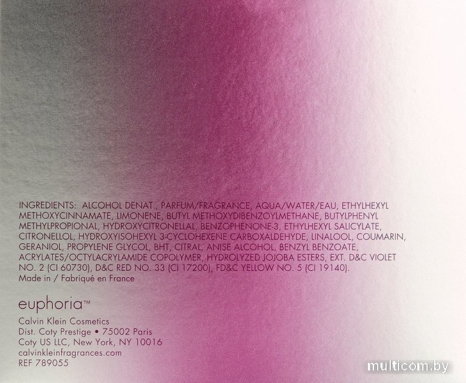 | Информация | Аромат раскрывается волнующими нотами цветков персика и мандарина. В сердце композиции - манящий и притягательный букет из нежного жасмина и розового пиона. Экзотический цветочный аромат продолжается притягательным фьюжн из пачули, мускуса и древесины кашемира, который оставляет длительный и манящий шлейф. Традиционный флакон Euphoria сохраняет гладкие внешние формы и соблазнительные изогнутые линии, он выполнен в насыщенном фиолетовом цвете, который, концентрируясь в центре флакона, постепенно смягчается ближе к краям, становясь более нежным. Переливы драгоценного розового аметиста на блестящей серебристой коробочке олицетворяют женственность и соблазнительность аромата. |