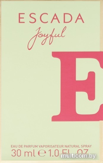| Информация | Joyful - яркий, жизнерадостный и просто волшебный цветочно-фруктовый парфюм, который поднимает настроение и вызывает искреннюю, задорную улыбку не только на лице той, которая носит аромат, но и на лицах окружающих людей. Выпущенный в 2014 году брендом Escada, парфюм стал истинным подарком к летнему сезону. Нежный розовый цвет парфюма и дизайнерский флакон с необычной пробкой в виде розового кристалла, перехваченного двумя полукольцами, дополняет нежный и позитивный образ духов. В начале композиция раскрывается чуть терпковатым ароматом черной смородины, спелой, медовой дыней и нежной цитрусовой свежестью мандарина. Затем начинает звучать светлый, жизнерадостный цветочный аккорд элегантного пиона и ванильно-сливочной магнолии в обрамлении нежного запаха листьев фиалки и аромата сочного бархатистого персика. Завершает аромат мягкий бархатистый сандал, купающийся в роскошных медовых аккордах. Парфюм дарит ощущение лета даже в самый пасмурный и холодный день, призывая к позитиву и оптимизму. |